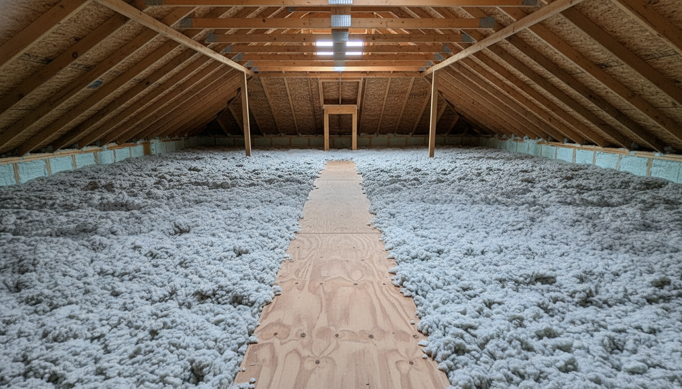 Loose-fill cellulose or fibreglass blown into attic cavities for maximum thermal coverage and energy efficiency.