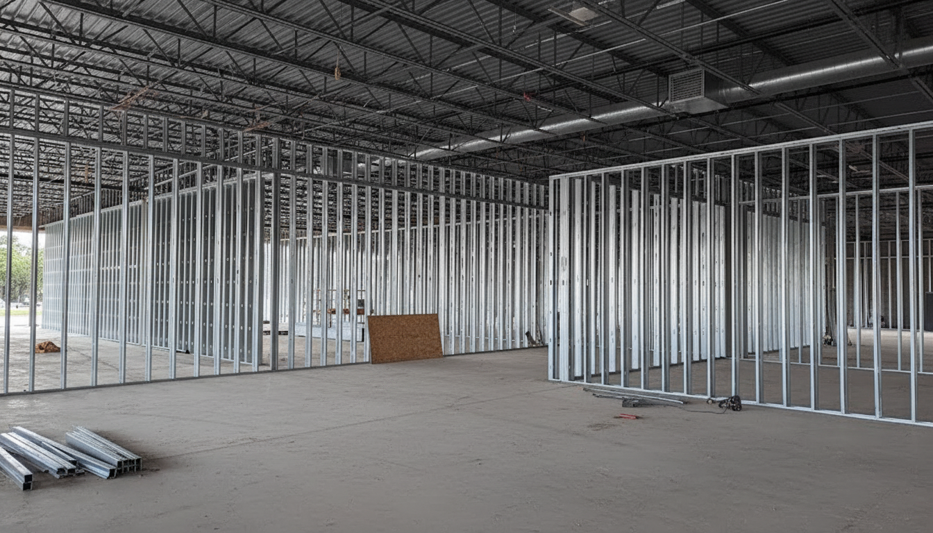 Light and heavy gauge steel stud systems for demising walls, soffits, and bulkhead structures.