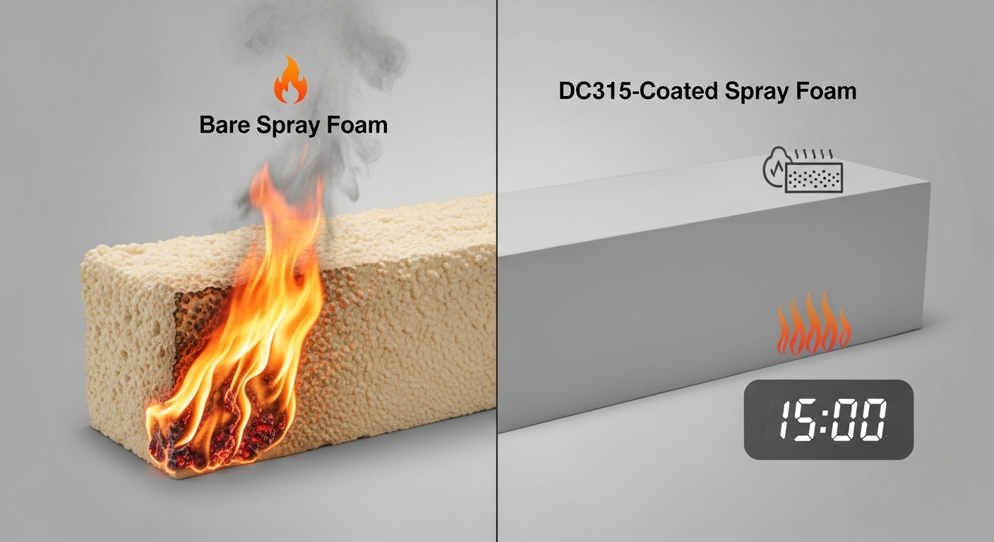 DC315 is an intumescent (heat-reactive) coating that is spray-applied directly over exposed spray foam insulation. When exposed to heat, DC315 expands to form a protective char layer that slows flame spread and buys critical evacuation time — meeting Ontario Building Code requirements for thermal barriers and ignition barriers.
