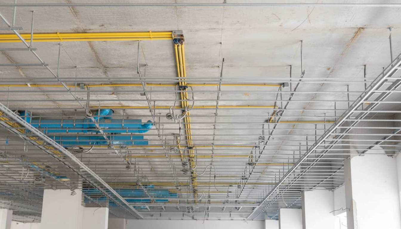 Suspended ceilings (also called drop ceilings or T-bar ceilings) consist of a metal grid framework hung from the structure above, with ceiling tiles or panels placed into the grid. This creates a finished ceiling plane while maintaining easy access to mechanical, electrical, and plumbing systems in the plenum space above.